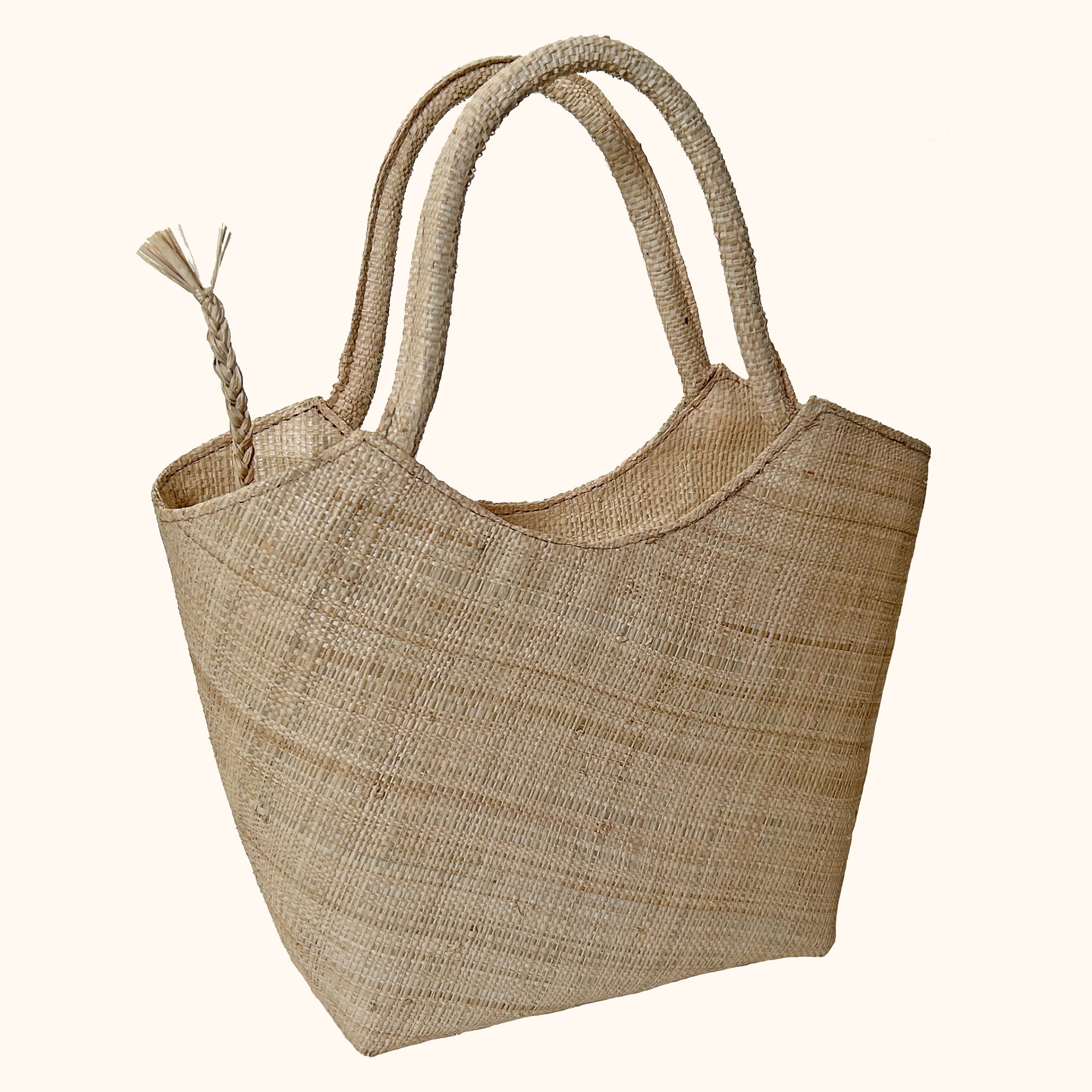 Handwoven with sustainable raffia. They have raffia handles, as well as a cotton lining with an inner pocket and a zip fastening with a small raffia tassel.