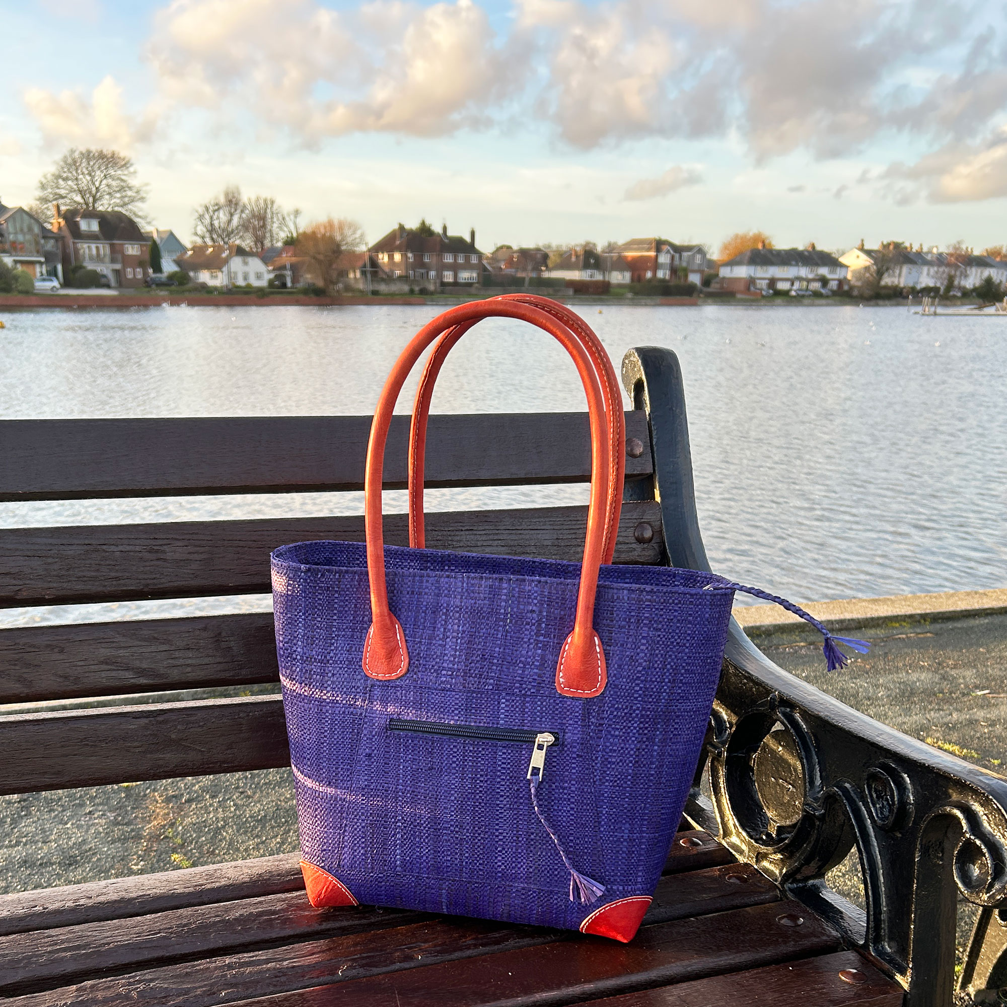 Handwoven with sustainable raffia and with woven palm panels inside plus a material lining with a side pocket.  They have a zip opening, side zip pocket,  leather corner protectors and leather handles just long enough to go over the shoulder.